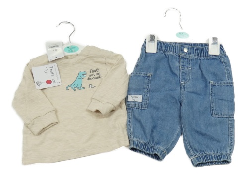 Nové - 2set - Modré rifle + béžové triko s dinosaury George