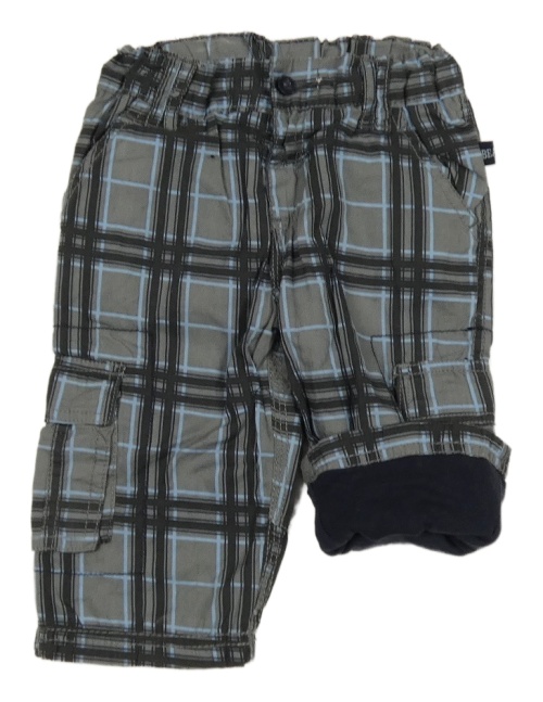 Šedo-modré kostkované plátěné podšité kalhoty s kapsami