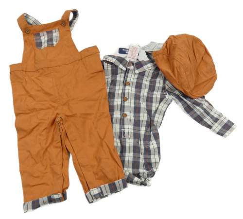 • Nové - 3set - Cihlové plátěné laclové kalhoty + kostkované košilové body + bekovka