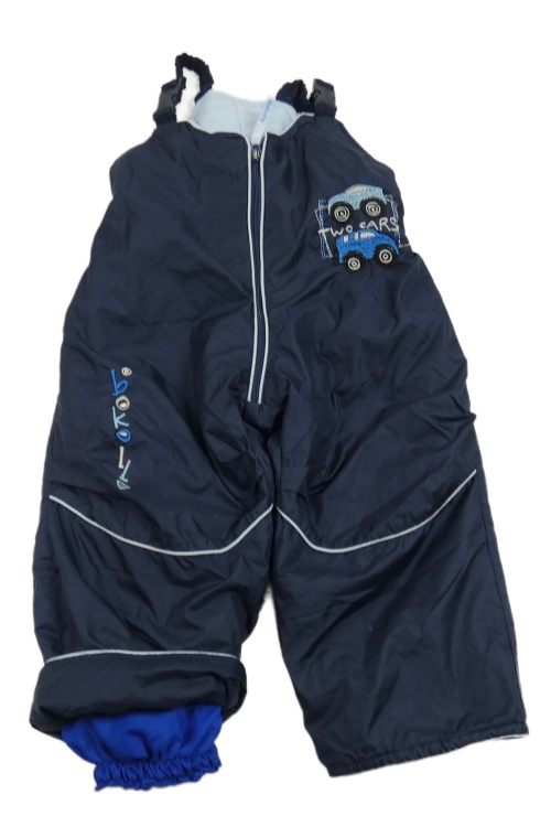 Tmavomodré šusťákové laclové oteplovačky s auty