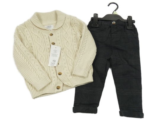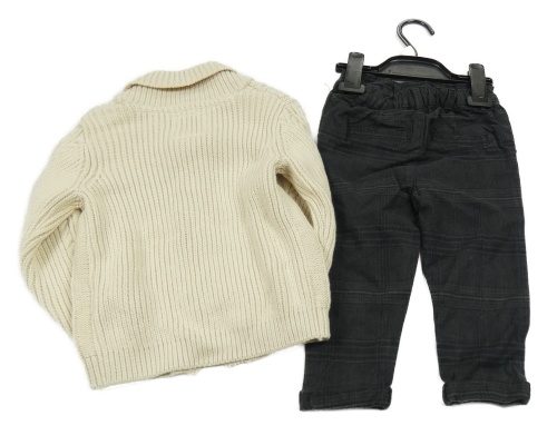 Nové - 2set - Tmavošedo-černé kostkované plátěné chino kalhoty + béžový propínací svetr F&F