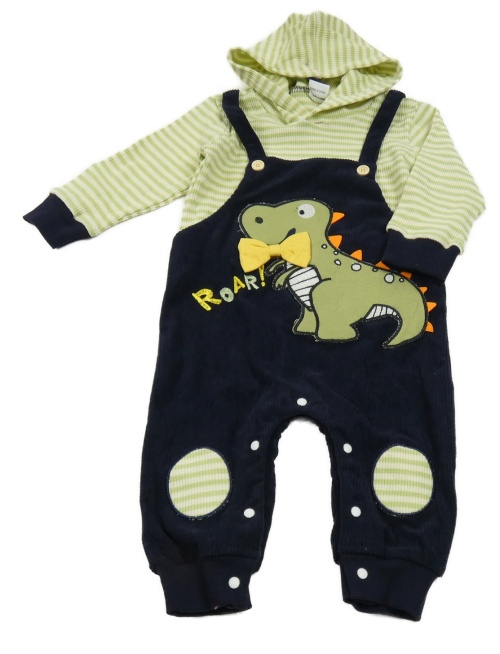 • Tmavomodré žebrované laclové kalhoty s dinosaurem a pruhovaným trikem s kapucí