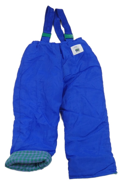 Královsky modré šusťákové oteplovačky s kšandami a nášivkou