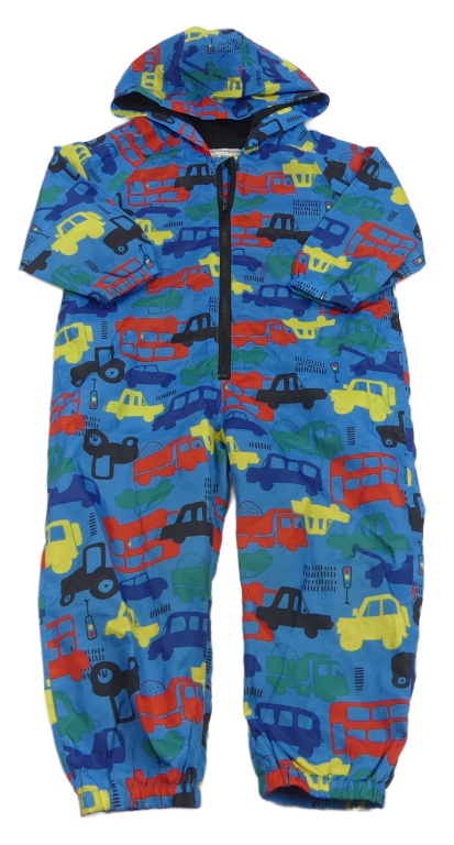 Modro-barevná šusťáková podzimní kombinéza s auty a kapucí Matalan