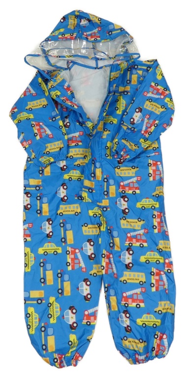 Modrá šusťáková lehká kombinéza s auty a kapucí