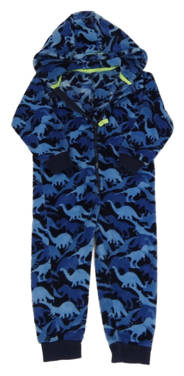 Modro-černá chlupatá kombinéza s dinosaury a kapucí