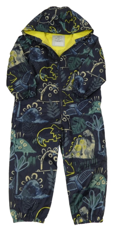 Tmavomodrá šusťáková podzimní kombinéza s dinosaury a kapucí George