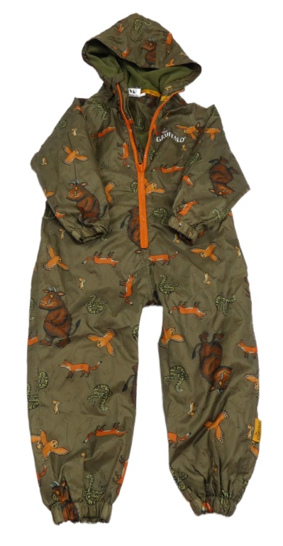 Khaki šusťáková jarní kombinéza s Gruffalem a kapucí