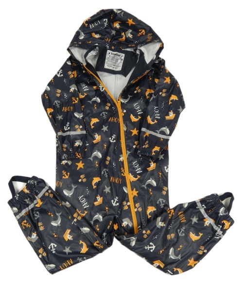 Tmavomodrá nepromokavá kombinéza s delfínky a parníčky a kapucí lupilu