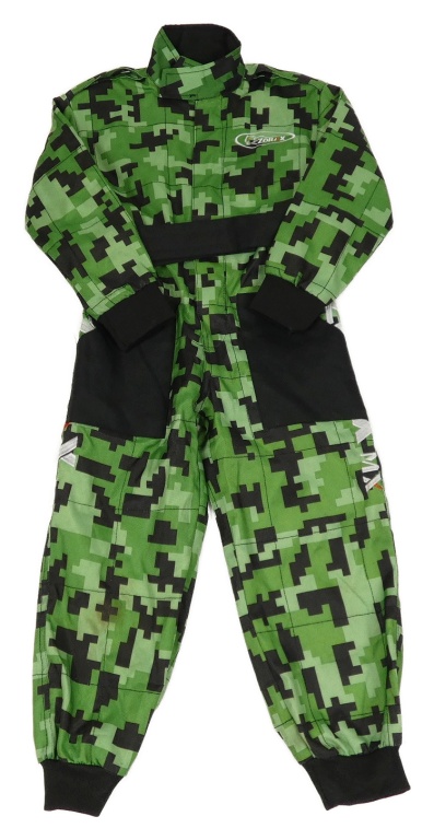 Zeleno-černá vzorovaná kombinéza s nápisem