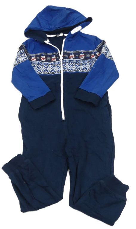 Tmavomodro-modrá tepláková kombinéza se vzorem a sněhuláky a kapucí