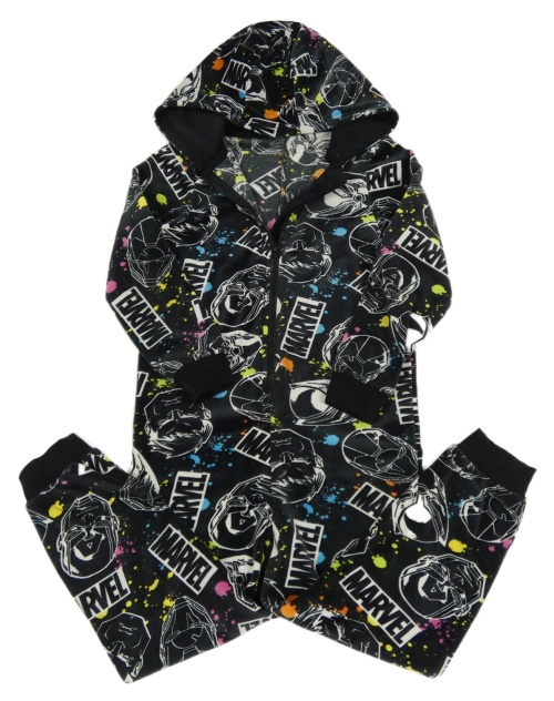 Černá vzorovaná plyšová kombinéza s Marvel a kapucí