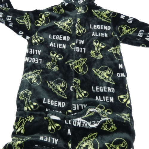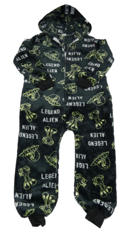 Černá plyšová kombinéza s nápisy a ufem a kapucí