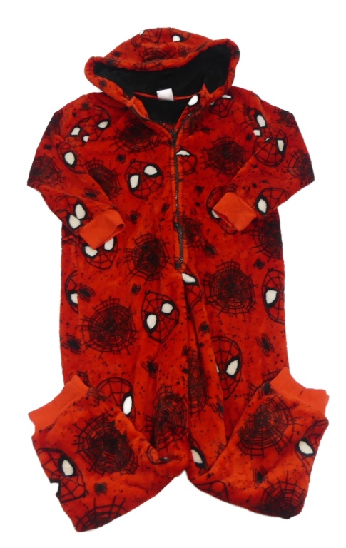 Červená chlupatá kombinéza se Spidermanem a kapucí