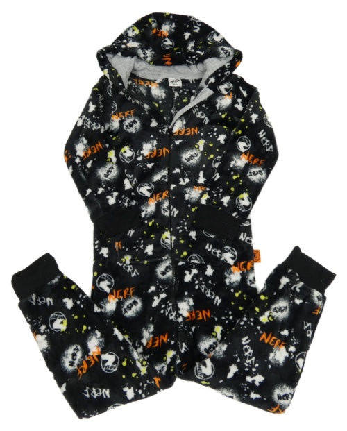 Černá plyšová kombinéza s logy - NERF a skvrnkami a kapucí Tu