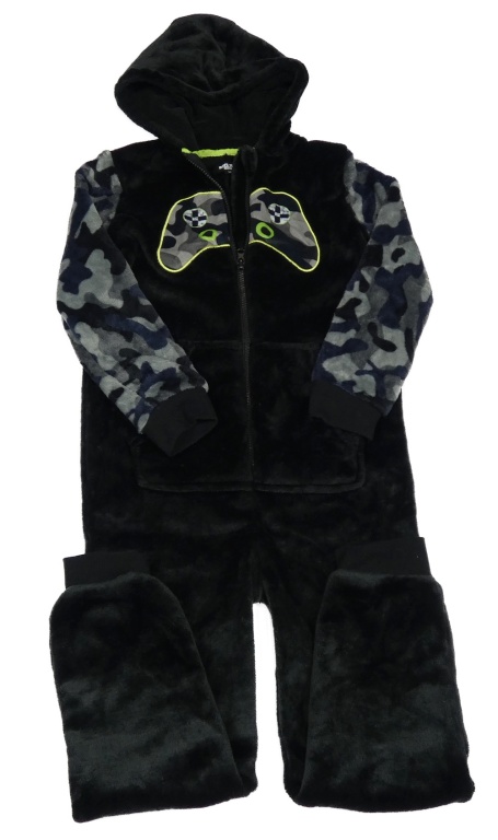 Černo-šedá plyšová kombinéza s ovladačem a kapucí
