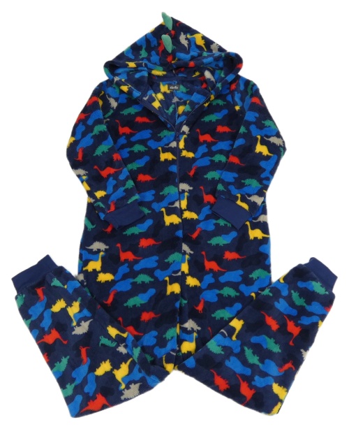 Tmavomodro-barevná chlupatá kombinéza s dinosaury a kapucí