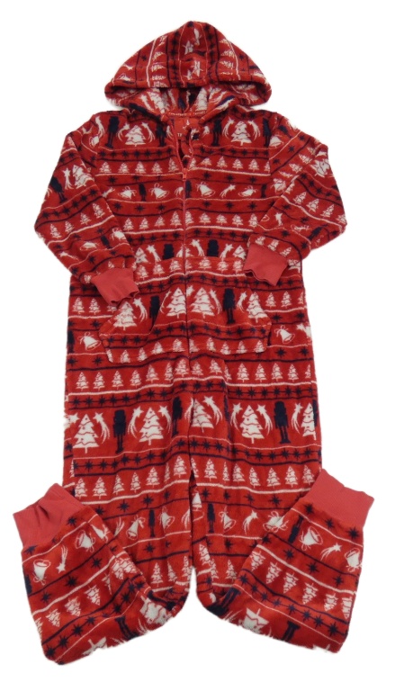 Červená vzorovaná chlupatá kombinéza se stromky a kapucí ThreadBare