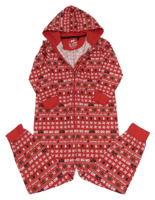 Červená vzorovaná kombinéza s ovladači a kapucí