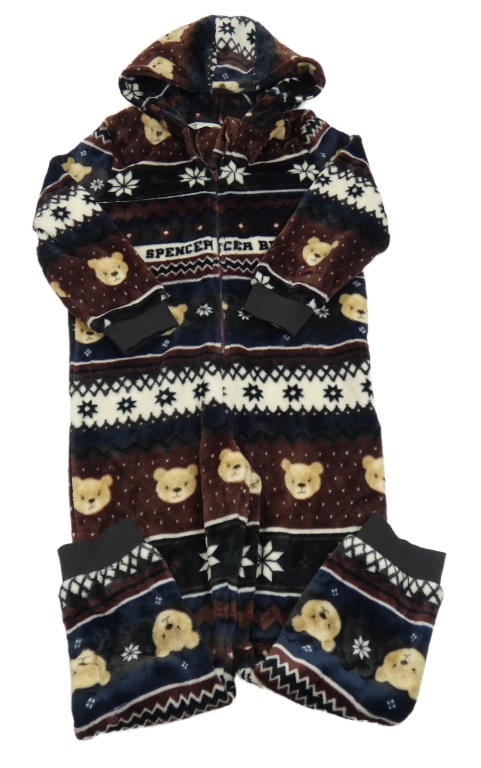 Tmavomodro-hnědá vzorovaná chlupatá kombinéza s medvědy a kapucí M&S