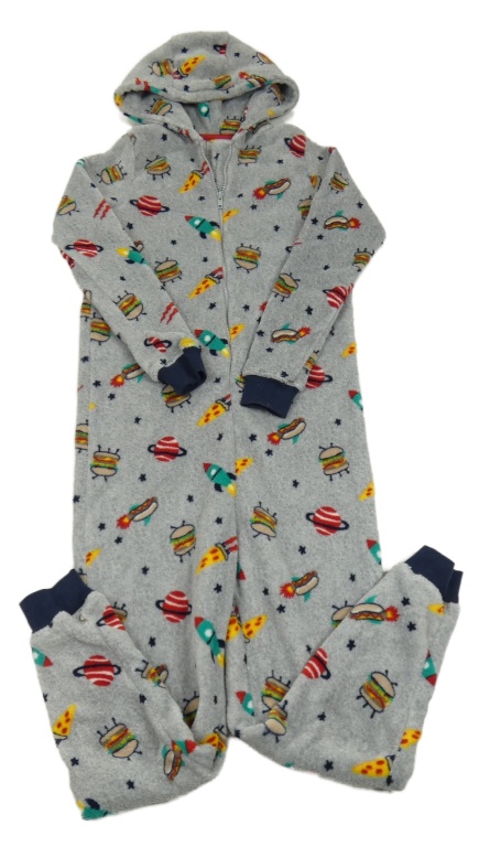 Šedo-tmavomodrá melírovaná plyšová kombinéza s raketami a planetami a kapucí Matalan