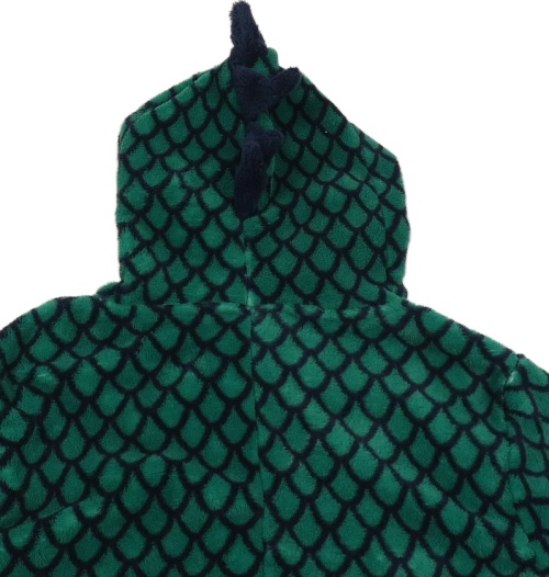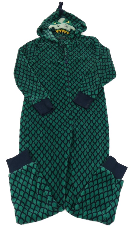 Zeleno-tmavomodrá vzorovaná plyšová kombinéza s kapucí - dino