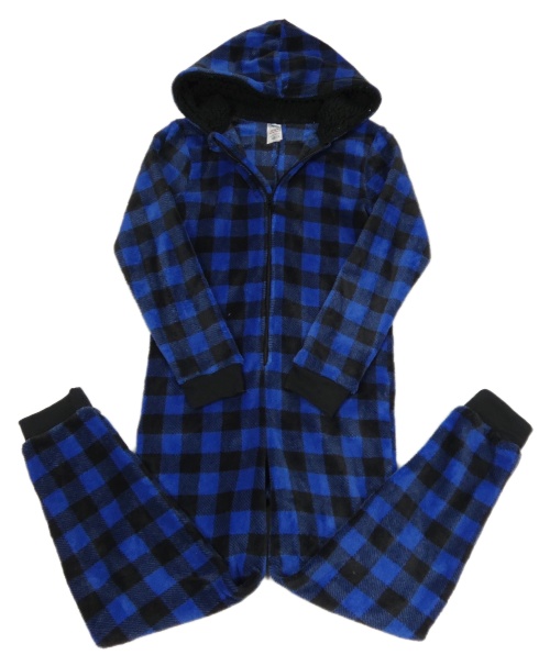 Tmavomodro-černá kostkovaná plyšová kombinéza s kapucí Peacocks