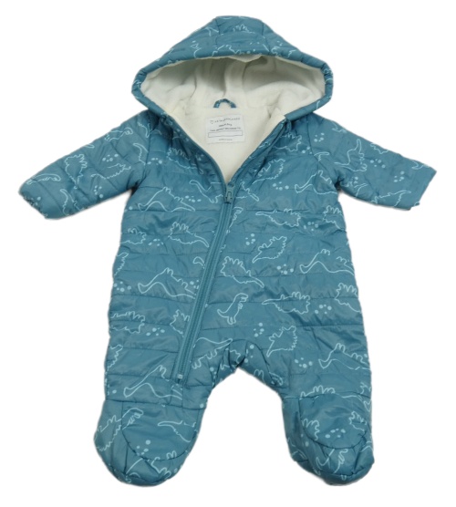 Modrá šusťáková prošívaná zimní kombinéza s dinosaury a kapucí Primark