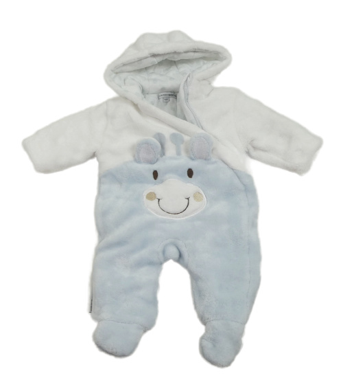 Bílo-světlemodrá chlupatá zateplená kombinéza s žirafou a kapucí