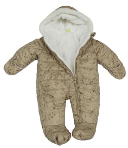 Béžová šusťáková prošívaná zimní kombinéza se zvířátky a kapucí