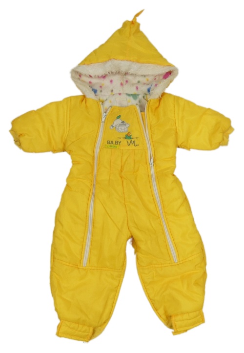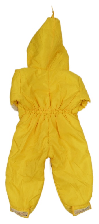 Žlutá šusťáková zimní kombinéza s pejskem a kapucí