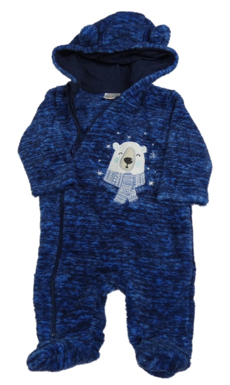 Tmavomodro-černá melírovaná plyšová kombinéza s medvědem a kapucí