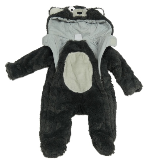 Tmavošedá kožešinová zateplená kombinéza s kapucí s čumákem