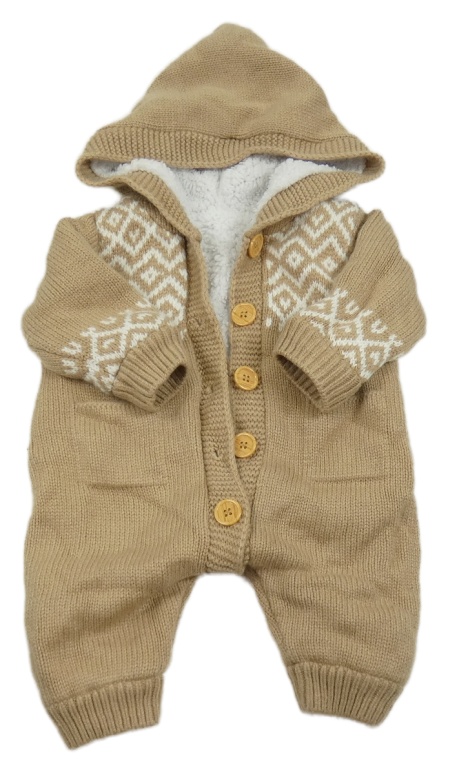 Hnědo-bílá vzorovaná pletená zateplená kombinéza s kapucí