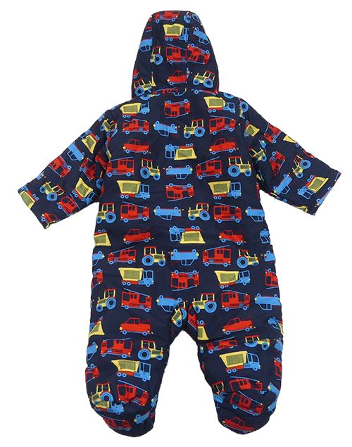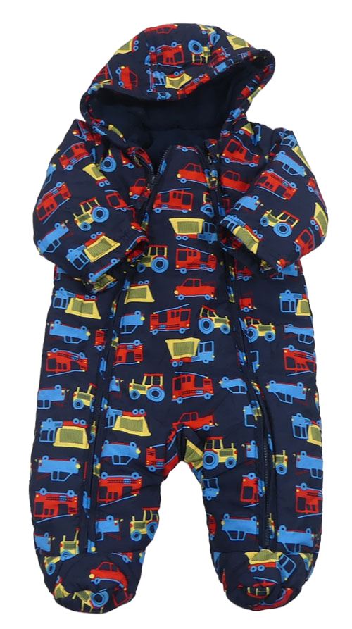 Tmavomodrá šusťáková zimní kombinéza s hasiči a stavebními stroji a kapucí M&S