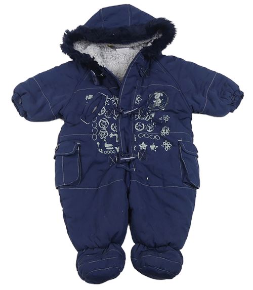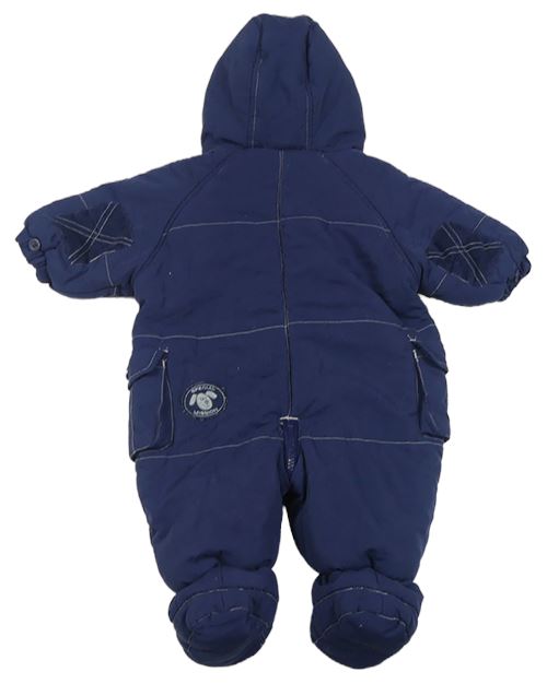 Tmavomodrá šusťáková zimní kombinéza s potiskem a kapucí
