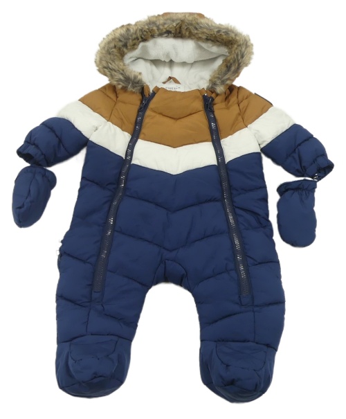• Tmavomodro-bílo-hnědá prošívaná šusťáková zimní kombinéza s nášivkou a kapucí s kožešinou + rukavice F&F