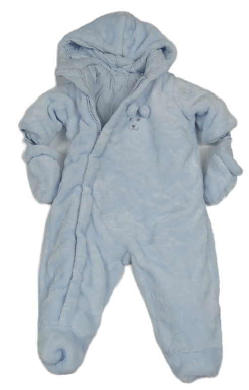 Světlemodrá plyšová zateplená kombinéza s medvědem a kapucí + rukavice