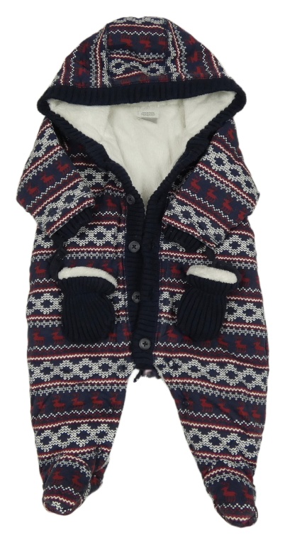 Tmavomodro-bílo-vínová vzorovaná zateplená kombinéza s kapucí + rukavice Mamas&Papas