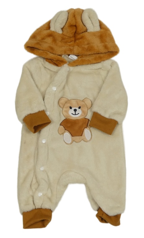Béžovo-hnědá chlupatá kombinéza s medvědem a kapucí