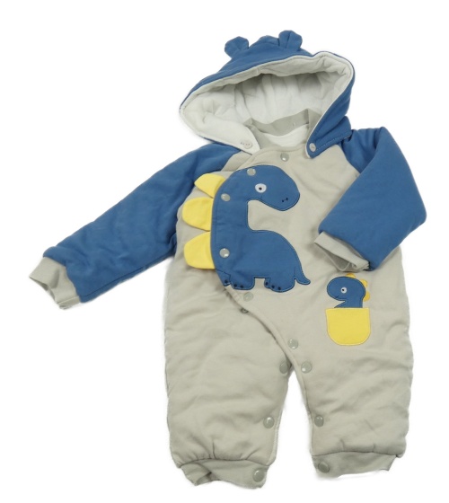 Béžovo-modrá bavlněná zateplená kombinéza s dinosaurem a kapucí