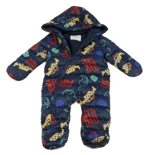Tmavomodrá prošívaná šusťáková zimní kombinéza s auty a autobusy a kapucí F&F