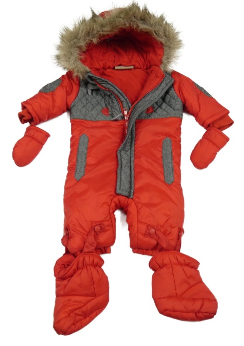 Červeno-šedá šusťáková zimní kombinéza s kapucí s kožešinou + rukavice + boty