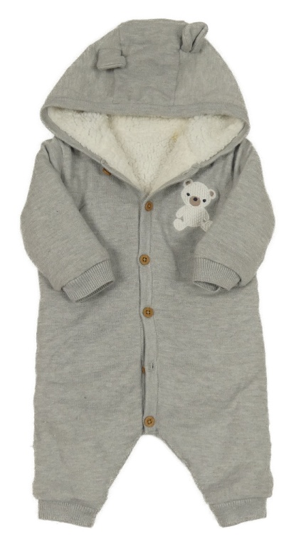 Světlešedá pletená zateplená kombinéza s medvědem a kapucí Little nutmeg