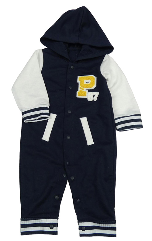 Tmavomodro-bílá kombinéza s písmenem a kapucí
