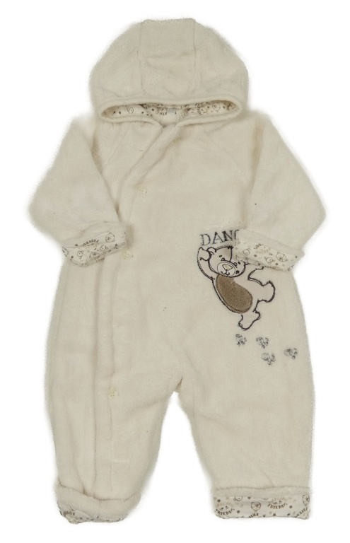 Smetanová chlupatá podšitá kombinéza s medvědem a kapucí