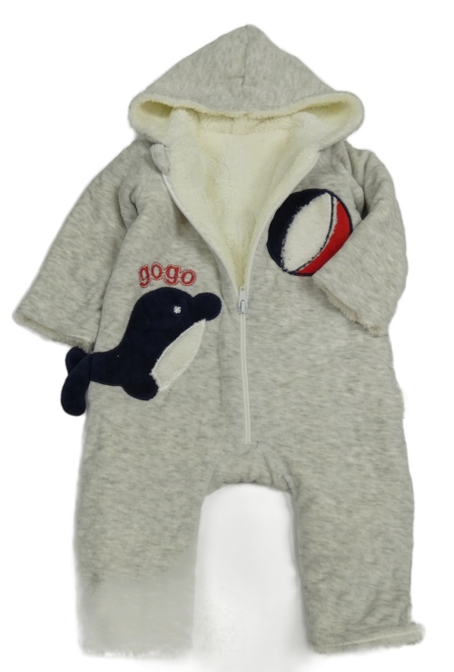 Šedá melírovaná sametová zateplená kombinéza s tuleněm a kapucí