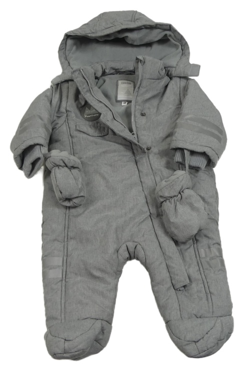 Šedá šusťáková zimní kombinéza s nášivkou a kapucí+ rukavice