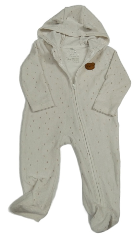 Bílá plyšová vzorovaná kombinéza s medvídkem a kapucí