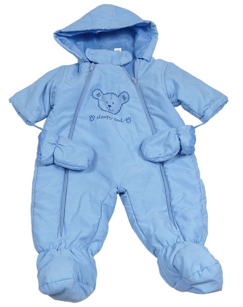 Světlemodrá šusťáková zimní kombinéza s kapucí + rukavice